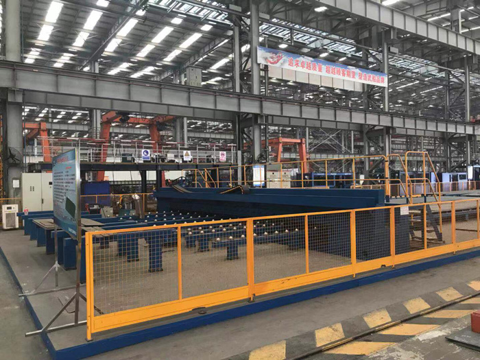 該設(shè)備主要由龍門綜合拼板架、物流傳送系統(tǒng)、焊接系統(tǒng)、數(shù)據(jù)監(jiān)控系統(tǒng)、集中潤(rùn)滑系統(tǒng)、電氣控制系統(tǒng)、坡口機(jī)、焊接小車及電源和檢修機(jī)位手弧焊電源等組成,設(shè)備整體區(qū)域范圍10m*20m。采用正面液壓琴鍵壓緊、反面加水冷銅套襯墊成型槽的方式進(jìn)行拼板對(duì)接焊接,采用雙絲氣保焊工藝,實(shí)現(xiàn)工件單面焊雙面成型。此單面焊雙面成型焊接工藝避免了傳統(tǒng)的兩面焊工件翻身問題,節(jié)省場(chǎng)地,降低作業(yè)強(qiáng)度,提高了焊接效率,實(shí)現(xiàn)流水線焊接,該拼板單面自動(dòng)化焊接工作站各部分之間可協(xié)調(diào)動(dòng)作,采用PLC可編程序控制器集中控制方式,整體設(shè)計(jì)緊湊,自動(dòng)化程度高,便于操作。輔助機(jī)構(gòu)配置齊全,可充分發(fā)揮整機(jī)的性能。