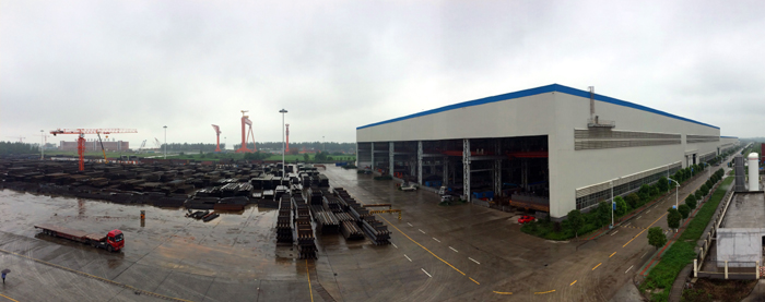 亞洲最大的鋼結(jié)構(gòu)聯(lián)合車間,涵蓋了鋼料堆場(chǎng)、鋼材預(yù)處理、理料、切割加工、部件裝焊、分段裝焊等鋼結(jié)構(gòu)建造工序。其最大跨度為39米,長755.2米,寬206米,建筑面積約12.5萬平方米,場(chǎng)內(nèi)最大起吊能力達(dá)到120噸,主要用鋼量達(dá)16000余噸。