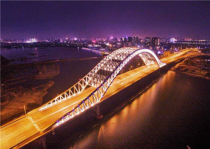 新六兩河大橋位于老六兩河大橋上游300米,大橋全長1945米,橋面寬約45米,雙向八車道,主跨達到240米。為了不影響唐白河的通航能力,大橋采用下承式連續剛桁架拱橋,從遠處看,大橋形似一道橫跨唐白河的美麗彩虹,顏值爆表,這種類型的橋梁不僅在襄陽是第一座,也是鄂西北首座,被襄陽市民們譽為一張新的城市名片。