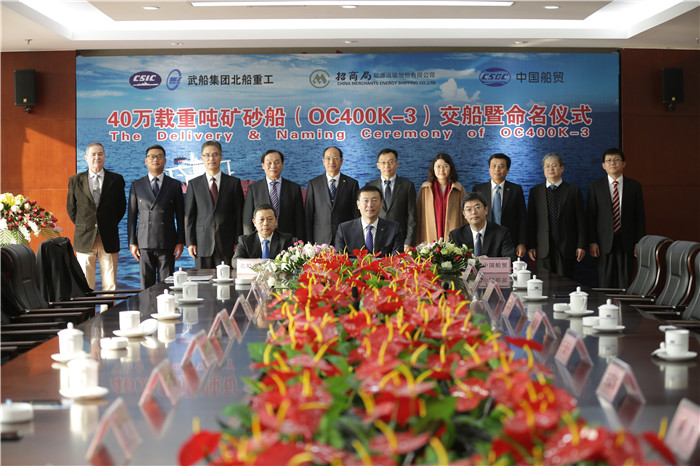 11月23日,武船集團北船重工為招商局能源運輸股份有限公司建造的第三艘新型40萬噸礦砂船“明業”輪命名交付并拔錨遠航。這是武船集團40萬噸礦砂船系列產品中交付的第5艘船。香港明華船務有限公司總經理丁磊,中船重工國際貿易有限公司船舶貿易部部長孫勇,武船集團黨委委員、北船重工董事長韓兵作為三方代表共同簽署了交接船議定書。