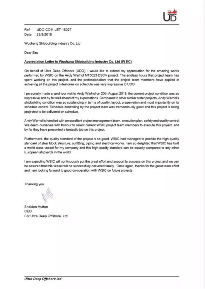 2018年8月20日,船東公司CEO Sheldon Hutton先生登船參觀在建的MT6023深潛水工作支持船后,對該船的質量、全船布置、設備保養,尤其是進度控制方面表達了高度認可;對武船高質量、高水準的制造水平及實力表示了肯定;對武船人專業、專注的敬業精神表示欽佩。