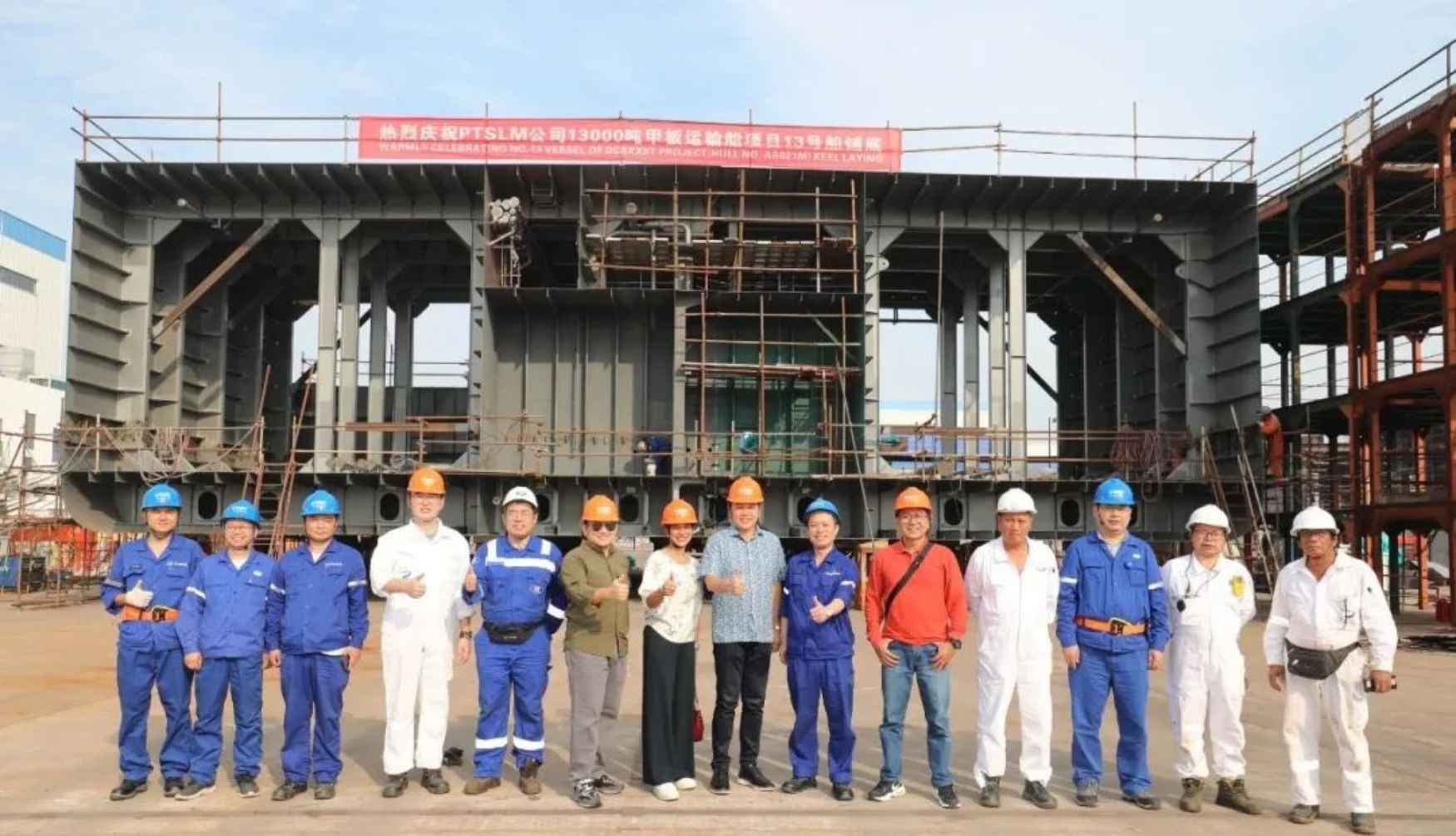 10月26日下午,由中國船舶集團武昌造船承建的13000DWT甲板運輸船13號船順利實現上船臺節點,標志著該船正式進入船臺搭載階段,船東、船檢以及各參建單位領導參加上船臺儀式。