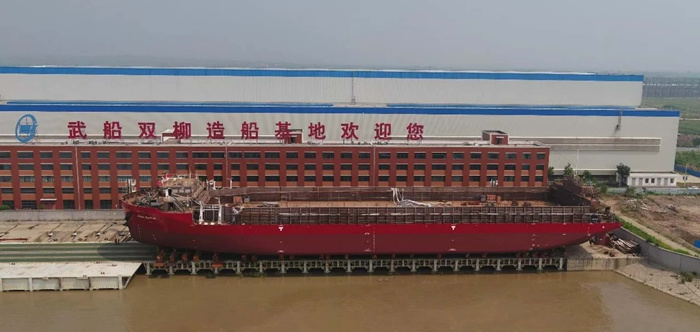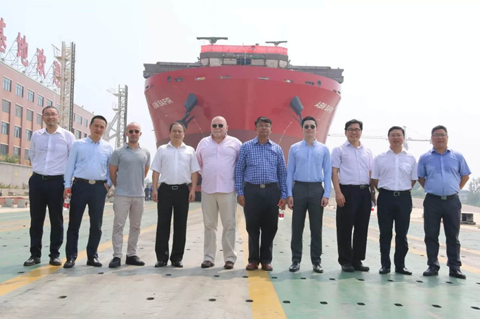 7月24日上午10時18分,烈日炎炎,彩旗飄動,由雙柳武船承建的13000DWT甲板運輸船最后一艘4號船在雙柳基地下水。船東代表法國路易達孚海運集團公司艾米力?杜,武昌船舶重工集團有限公司副總經理田軍,武船集團雙柳武船黨委書記、董事長楊國平等參加了下水儀式。4號船的順利下水,標志著在雙柳武船全體員工努力下,在設計師、工程師和驗船師的積極幫助下,13000DWT項目進入全面收官的關鍵沖刺階段。