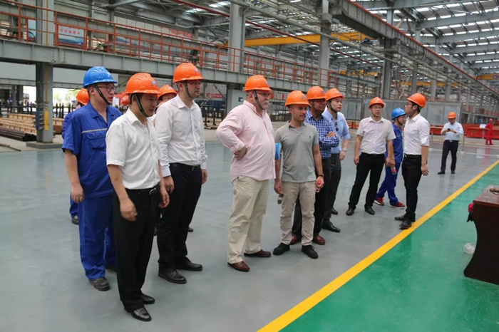 儀式后田軍帶領艾米力?杜等一行參觀雙柳武船分段車間