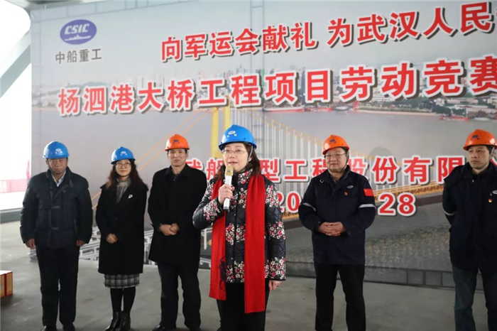 武漢市總工會黨組書記、常務副主席王芳,武船集團黨委副書記、工會主席楊少稀出席啟動儀式,并授予武船楊泗港大橋項目部“勞動競賽攻堅隊”旗幟。本次活動旨在全力推進大橋建設速度,掀起了大干快上熱潮,加快推進楊泗港大橋項目建設。