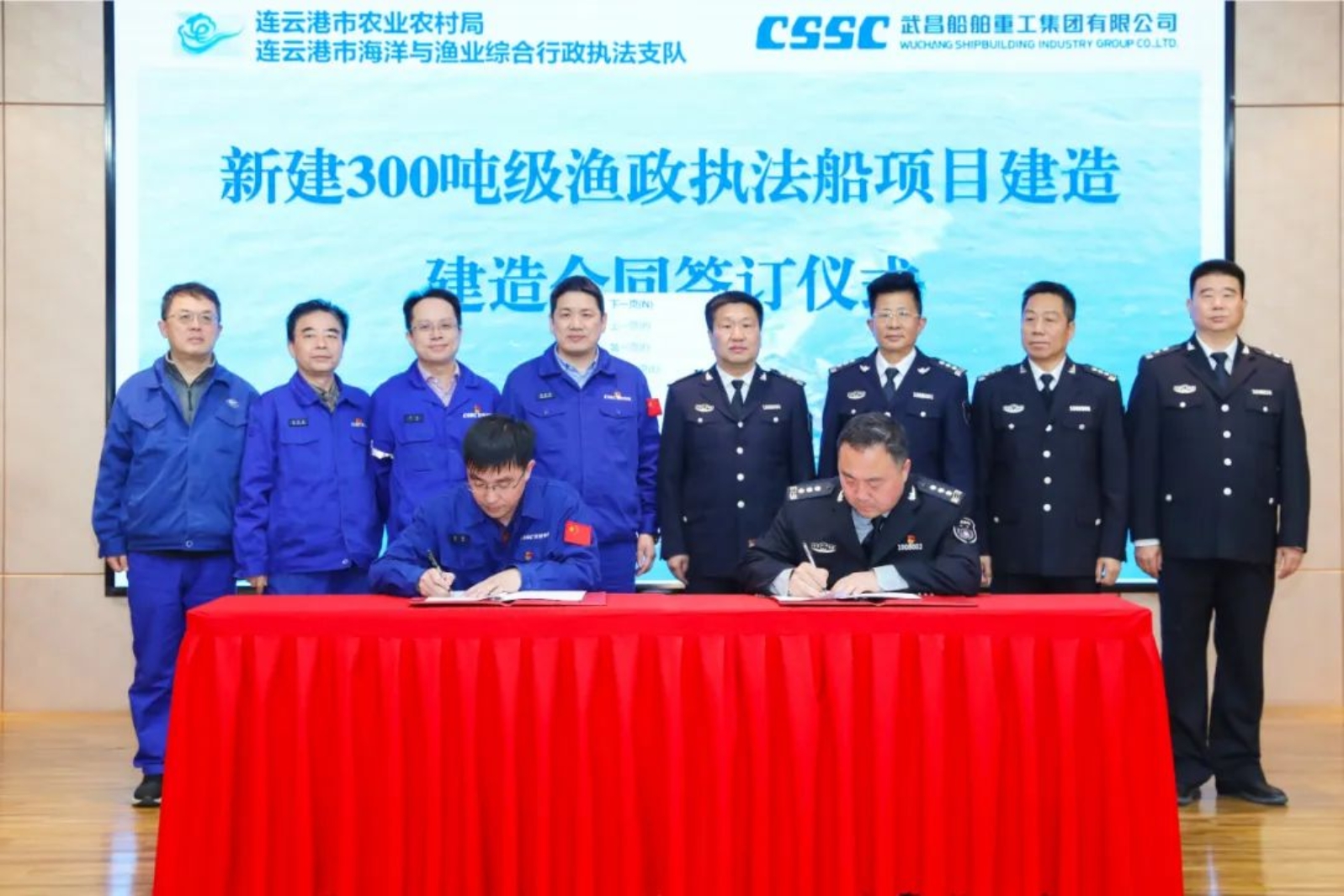 4月6日下午,中國船舶集團武昌造船與連云港市海洋與漁業綜合行政執法支隊簽訂新建300噸級漁政執法船項目建造合同,簽約儀式在武昌造船雙柳廠區舉行,連云港市海洋與漁業綜合行政執法支隊支隊長張長春、公司經營部副部長余俊代表雙方在建造合同上簽字。