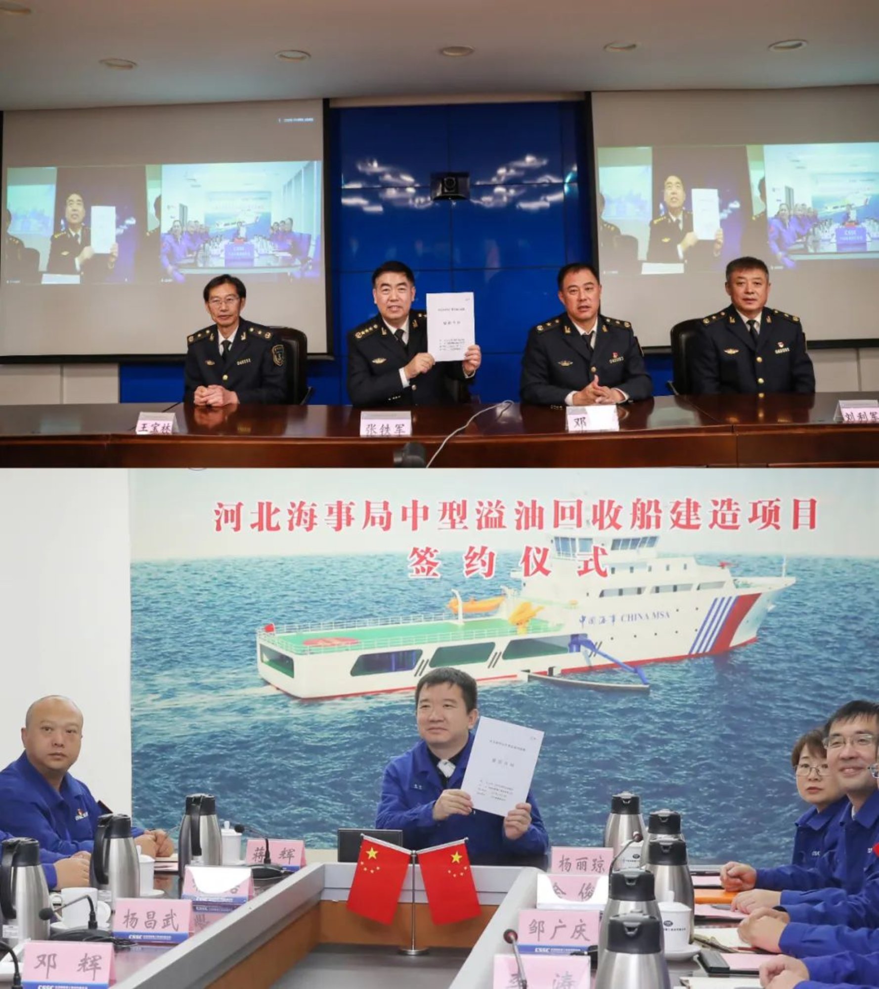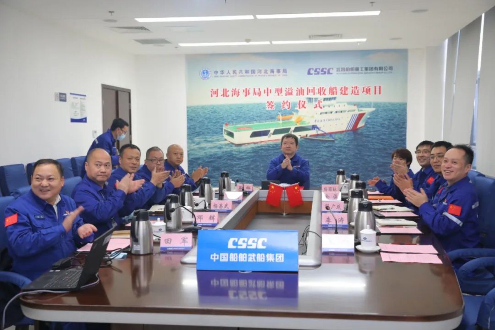 2022年11月21日,中國船舶武船與河北海事局通過“云簽約”形式簽訂一艘河北海事局中型溢油回收船建造合同。