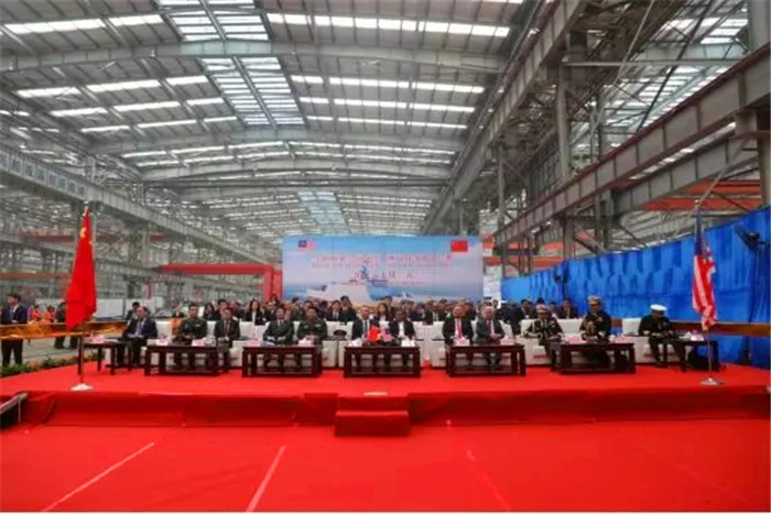 10月23日,馬來西亞瀕海任務艦項目2號艦開工及1號艦上船臺活動在武船雙柳基地成功舉行。中船重工總經理吳永杰、馬來西亞國防部部長沙布先生出席活動并致辭。中船重工副總經理吳曉光,馬來西亞國防軍總司令祖克弗里上將,武船董事長楊志鋼、副總經理姚勝華及馬來西亞海軍、馬來西亞莫實德船廠、中國政府及軍隊相關部門、中國船級社、中船重工等單位相關領導及代表蒞臨活動現場。