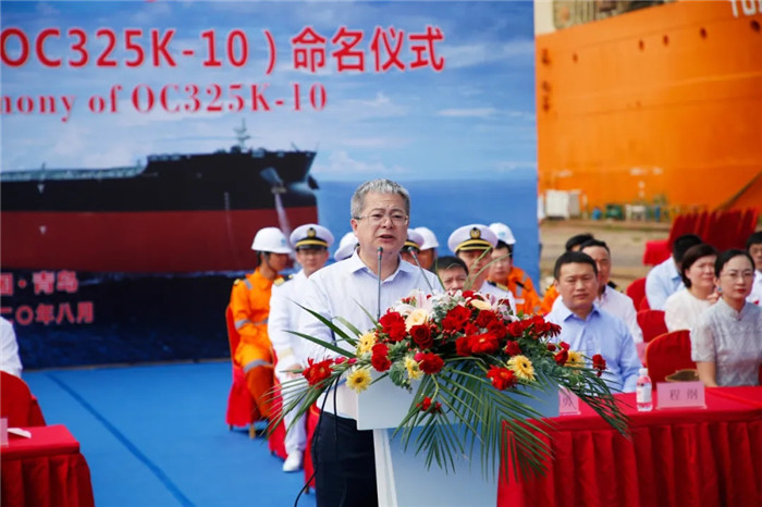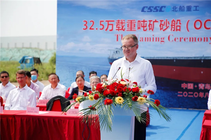 儀式現場由北船重工副總經理鮑會勇主持命名暨交船儀式,北船重工總經理谷克超、上海船舶研究設計院黨委書記王麟、中國船級社青島分社總經理朱永實、勞氏船級社全球首席運營官Mark Darley、香港明華船務有限公司副總經理李霖、工銀租賃航運金融事業部執行總經理郭芳萌先后致辭,工銀租賃項目與投資審批部副總經理高潔將本船命名為“ORE CHONGQING”并為其砍纜。