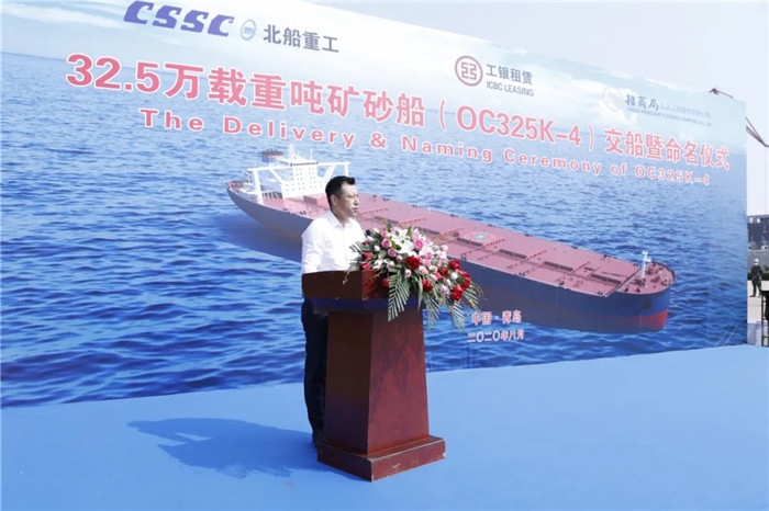 上午9:00,武船集團北船重工為工銀租賃和招商輪船建造的第四艘32.5萬噸礦砂船“ORE CHONGQING”輪命名暨交船儀式在3號碼頭舉行,這是各方在黨中央的正確領導下,抗擊疫情取得的重要成果。工銀租賃航運金融事業部副主管賈浩、北船重工總經理谷克超代表雙方簽署了交船議定書。