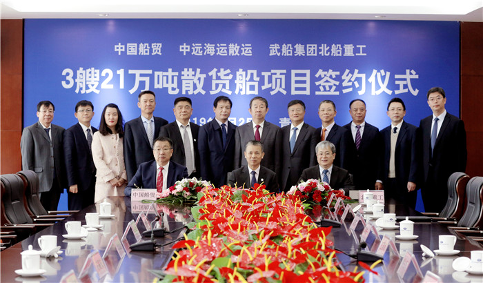 4月25日,武船集團北船重工與中遠海運散貨運輸有限公司舉行新造3艘21萬噸散貨船項目簽約儀式。這是雙方首次進行的一次重大戰略合作,也是北船重工在造船市場上開發的新船型。
