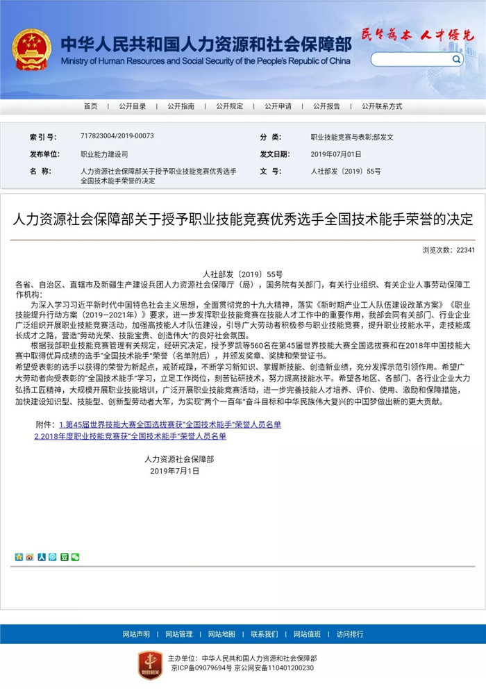 日前,人社部決定授予在第45屆世界技能大賽全國選拔賽和在2018年中國技能大賽中取得優異成績的選手“全國技術能手”榮譽,并頒發獎章、獎牌和榮譽證書。