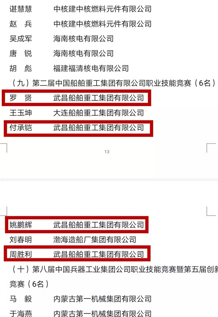 2018中國技能大賽?C?C第二屆“船舶杯”中船重工職業技能競賽過程中,武船集團下屬單位模塊公司姚鵬輝、軍船公司羅賢、北船重工周勝利、船舶公司付承鎧等參賽選手認真備考應考,按照比賽規則出色完成了全部比賽科目,從中船重工16支代表隊的81名選手中脫穎而出,姚鵬輝和羅賢分別斬獲船體裝配工和船舶電焊工比賽第一名,周勝利、付承鎧分別獲得船體裝配工和船舶電焊工比賽第三名,展現了高超的船舶建造技藝。按照《中華技能大獎和全國技術能手評選表彰管理辦法》和《人力資源和社會保障部關于組織開展2018年中國技能大賽的通知》要求,在2018中國技能大賽?C?C第二屆“船舶杯”中船重工職業技能競賽(國家級二類競賽)決賽中獲得前3名成績的武船職工姚鵬輝、羅賢、周勝利、付承鎧被人社部授予“全國技術能手”榮譽稱號。