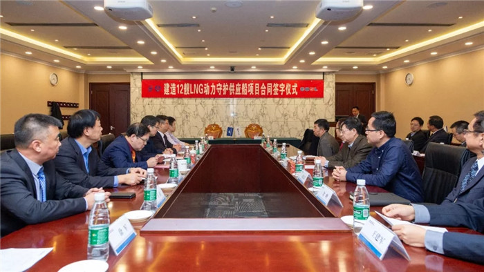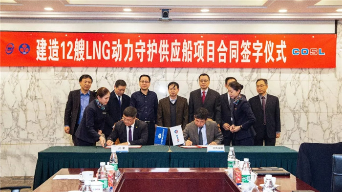 2018年11月30日下午,武船集團和中海油田服務股份有限公司簽署兩型8艘4000馬力LNG動力守護供應船建造合同,中海油田服務股份有限公司船舶事業部黨委書記、總經理車永剛和武船集團雙柳武船黨委書記、董事長楊國平代表雙方在合同上簽字。中海石油(中國)有限公司開發生產部副總經理劉建忠,中海油田服務股份有限公司CEO兼總裁、黨委副書記曹樹杰、副總裁兼安全總監余峰、裝備總監兼裝備管理部總經理王建軍、采辦共享中心總經理王冬石,中國船級社副總裁朱愷,天海融合防務裝備技術股份有限公司董事長劉楠,武船集團經濟運行部部長羅金華等相關領導及人員出席簽約儀式。
