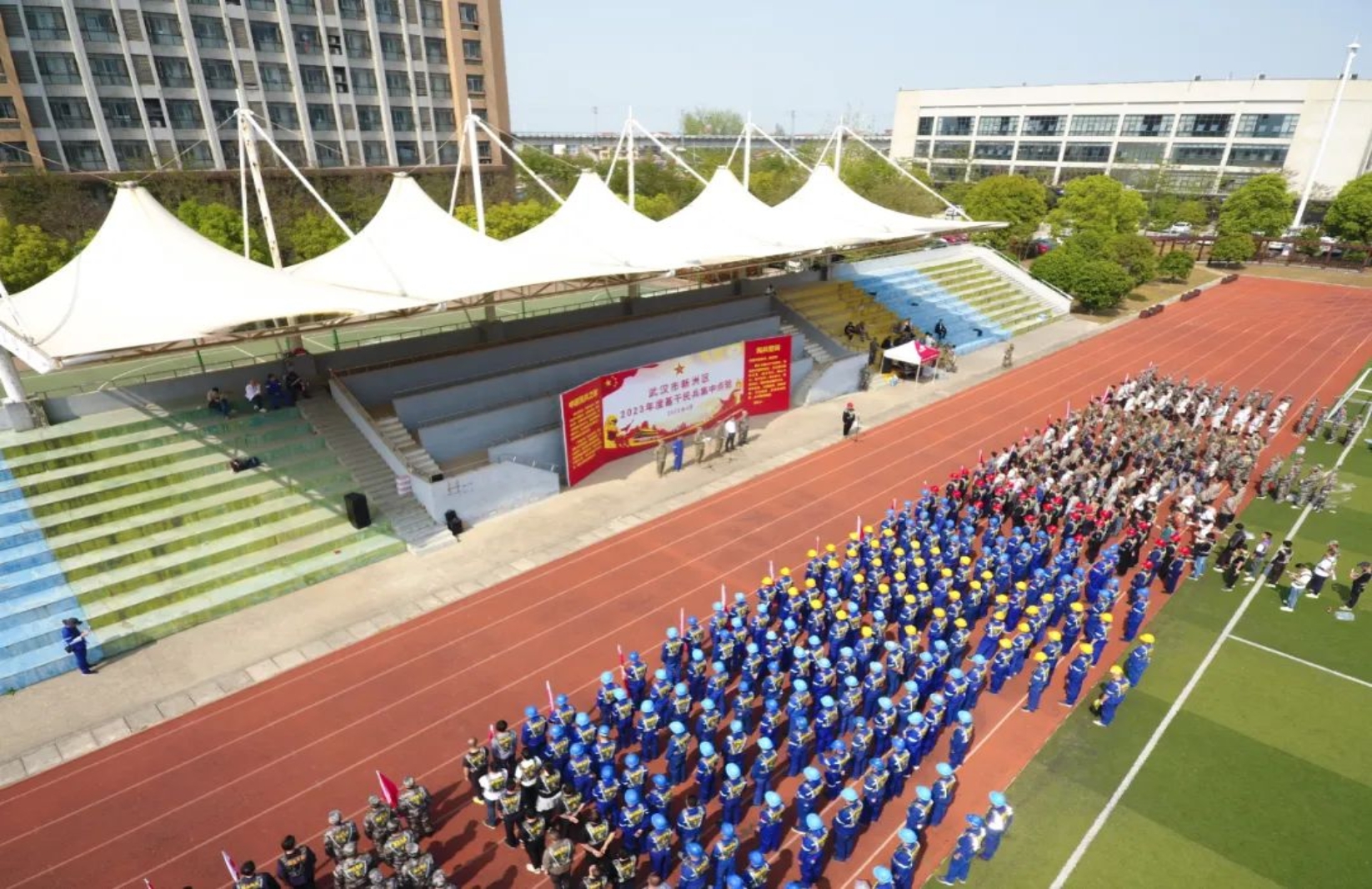 4月10日,風和日麗,軍旗飄揚,武漢市新洲區基干民兵點驗大會在中國船舶集團武昌造船體育場隆重舉行。新洲區委常委、區人武部政委陳勇、區人武部部長馮俊明、區人民政府辦黨組成員高擁軍、相關街鎮及高校武裝部長、武昌造船安保部有關負責人出席本次點驗大會。同時參加點驗大會的還有雙柳片區基干民兵 670名,其中武昌造船基干民兵 200 名。