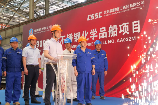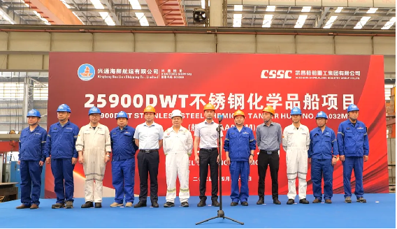4月23日10點38分,由中國船舶集團武昌造船為興通海運股份有限公司下屬子公司興通海獅航運有限公司建造的25900載重噸不銹鋼化學品船1號船正式開工。興通海運股份有限公司副總裁陳其德一行及現場監造團隊,美國船級社,武昌造船黨委委員、副總經理田軍及公司各部門相關負責人參加開工儀式。